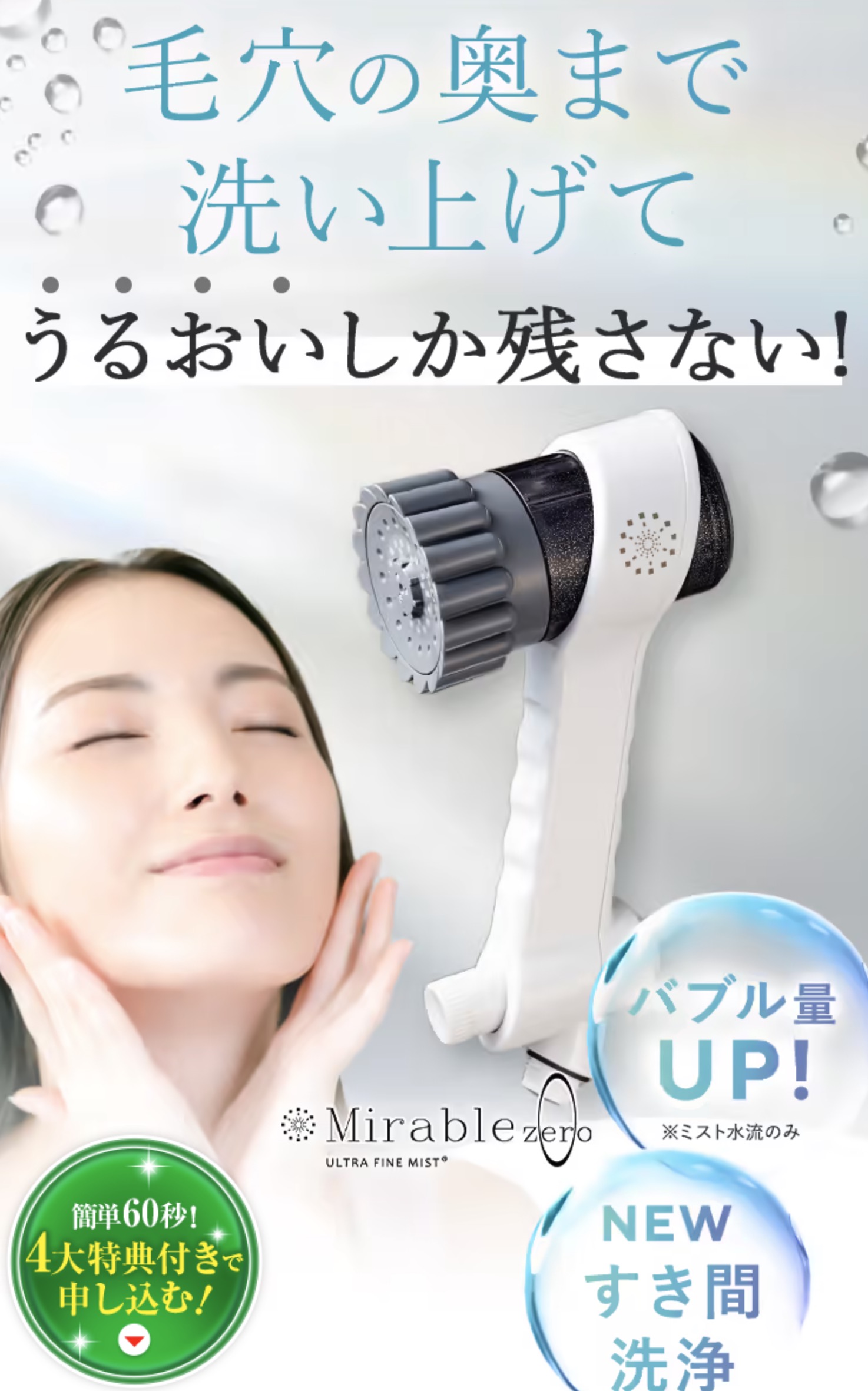 ミラブルZEROは、“ウルトラファインバブル”の力で毛穴の奥まで汚れを除去する、美顔器級のシャワーヘッドです。